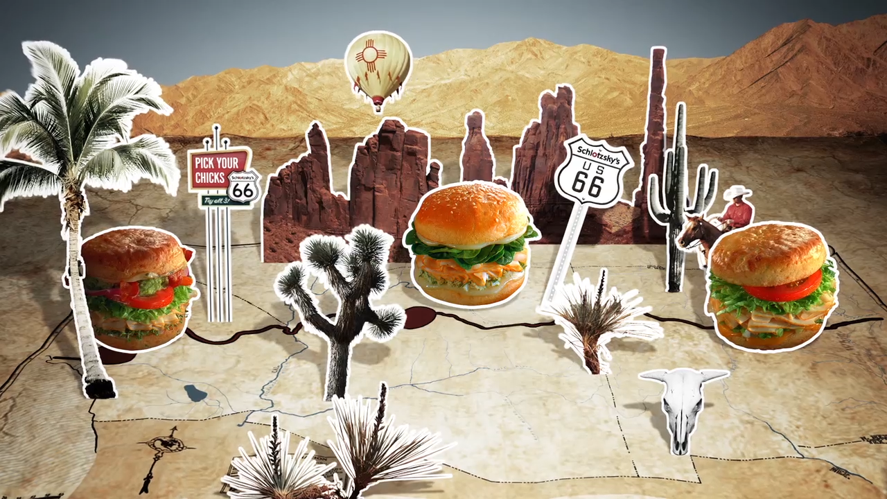Campaign for Schlotzsky's highlighting different destinations along Historic Route 66.